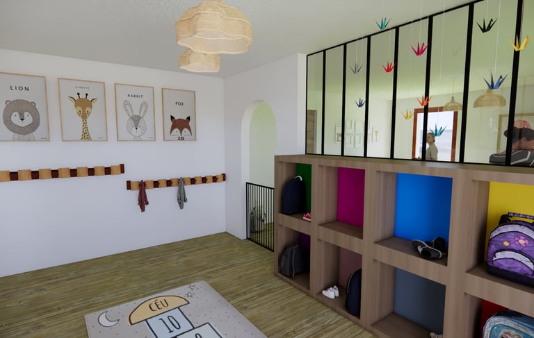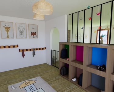 Ce projet d'aménagement pour une Maison d'Assistantes Maternelles crée un environnement sécurisé, fonctionnel et stimulant pour les enfants, tout en offrant aux assistantes maternelles un espace de travail pratique et agréable. Chaque zone est pensée pour allier confort, sécurité et épanouissement, du coin jeux à l'espace de repos et de cuisine.