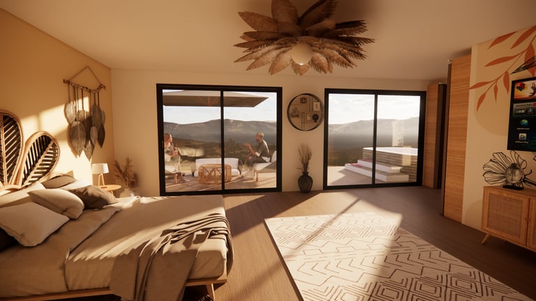 Réalisation d'une chambre bohème avec une vue sur la nature