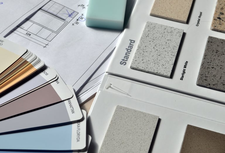 Planche d’ambiance : Une sélection de couleurs, matériaux et éléments décoratifs adaptés à votre espace.